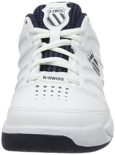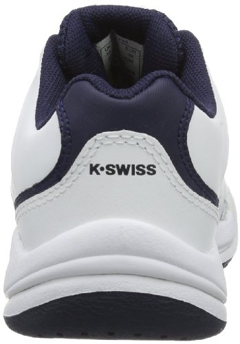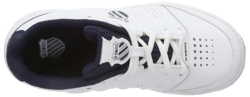 Ein speziell für Kinder entwickelter Vollleder-Tennisschuh im sportlichen Design. Er ist ausgestattet mit einer abriebfesten Omni-Gummilaufsohle und einer Druckgeformten EVA Schalensohle. Die Ghillie-Schnürung für einfache Schnüren und besseren Halt gestaltet den Schuh für die kleinen Tennisspieler als super angenehm. * Obermaterial: Leder * Mittelsohle – EVA Schalensohle mit integrierter Dämpfungseigenschaft über die gesamte Mittelsohle; Torsionsstabilität * K-EVA Dämpfungstechnologie: für maximale Dämpfung im Zwischensohlenbereich * K•SWISS-Shield auf der Außenseite und auf der Zunge * K•SWISS-Shriftzug auf der Ferse * Doppelt verstärkte Vorderkappe zum Schutz gegen Abrieb * Gummisohle: Außensohle für Langlebigkeit von der Ferse bis zu den Zehenspitzen * Omni Profil = für Kunstrasen und Sandpläze