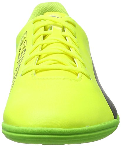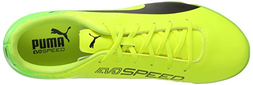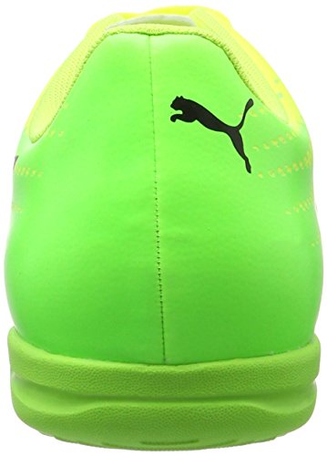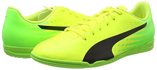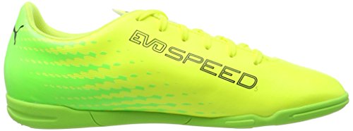 PUMA EVOSPEED 17.5 IT. Indoor-Fußballschuhe aus weichem und robustem Kunstleder; gepolsterter Einstieg; Fersen-Kappe; Obermaterial aus Synthetik; Innensohle aus Textil; nicht abfärbende Gummi-Außensohle.